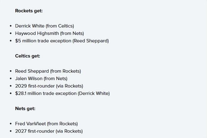 怀特已31岁,凯尔特人队借此机会实现后卫线的年轻化。谢泼德在2024年NBA官网总经理调查中,位列最受看好的新秀之一。凯尔特人队有条件让他在比赛中逐步成长,而志在争冠的火箭队无法提供这样的环境。